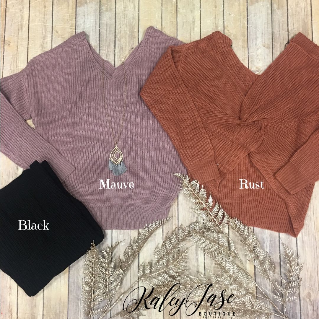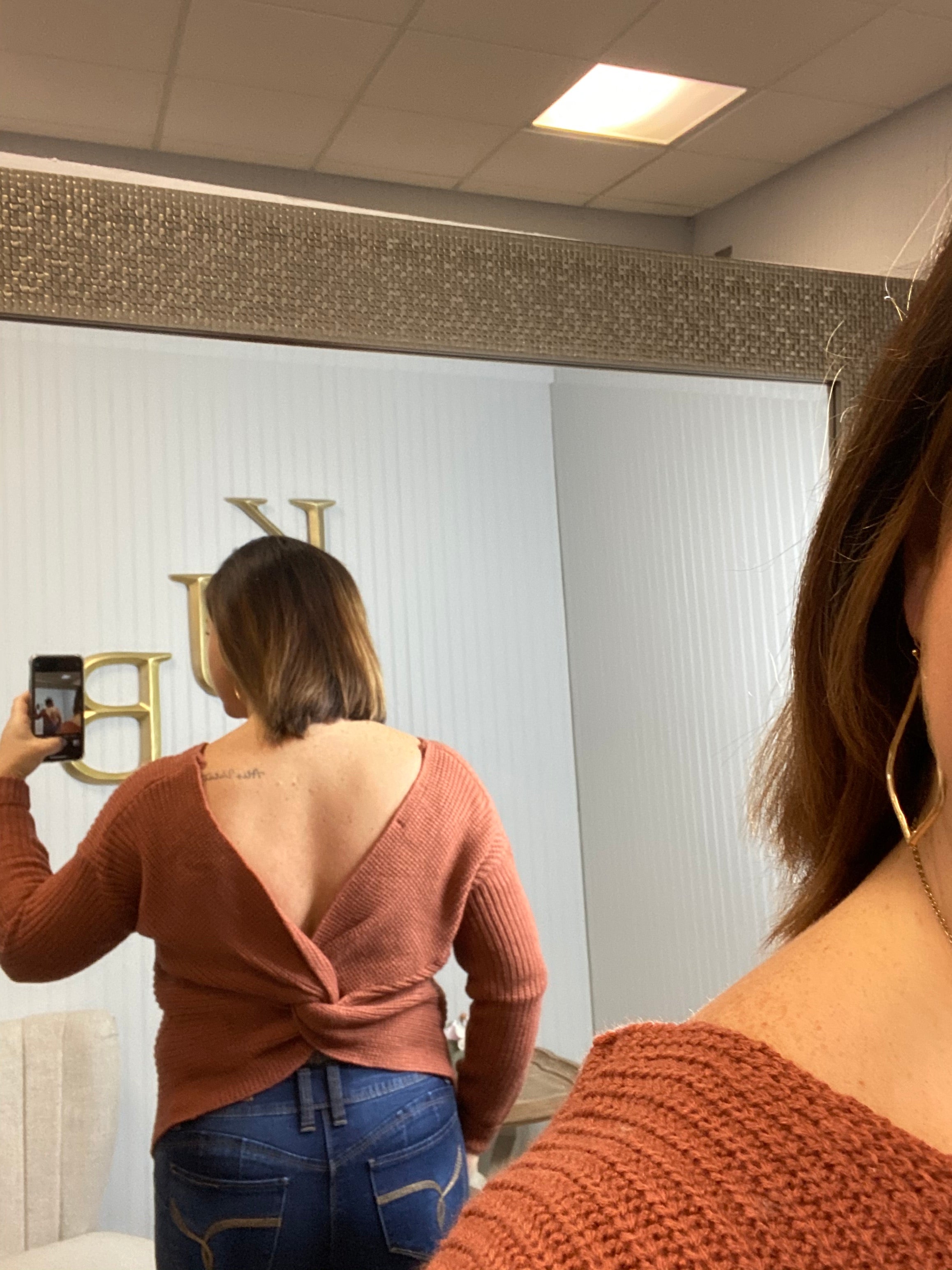 Super cute sweater for fall & winter from the front but then turn around and its got a unique twist back! Thick knit sweater fabric. Add a cami or bralette for extra style or coverage. Marie was wearing a normal bra with this top.
